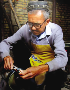 我們在另一條偏僻的小巷里,見到了“塔石罕”最小的兒子艾合買提·塔石,他今年48歲,從18歲開始學藝。由于父親的威望,來拜訪他或買小刀的人很多。我們來到他家時,他正在院中制作小刀,面前擺放著小榔頭、銼、鉆、錐、老虎鉗、砂輪、砂紙等工具,還有一些正等待加工的刀胚。他告訴我們,做小刀的工藝很復雜,要將挑選出的好鋼好鐵進行鍛打、沾火、造型、銼磨、鑲嵌銅、骨、花紋等一系列的工藝,一把好刀要四五天才能做好。我們發(fā)現,他制作的小刀柄部均以孔雀頭為造型,上有孔雀羽毛的圖案,看上去華麗而高檔,令人愛不釋手。艾合買提·塔石給我們展示了他的不少“作品”,長短不一,最長的一把折刀拉出刀子有40厘米,明晃晃的,非常漂亮。這種刀是宰羊、殺瓜絕好的工具。艾合買提·塔石在他做的刀子上打印了“5”的字樣,謹防假冒,同時也是質量保證的標記。