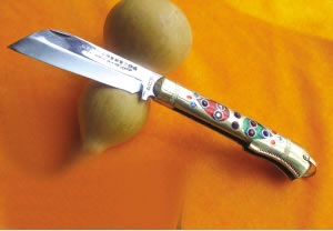 我們有幸在這街上見到了“塔石罕”的徒弟羅赫曼·芒蘇爾,他的小刀注冊了商標并在自治區(qū)獲過獎。在他的貨架上,我們見到了幾乎包括了各種類型的沙雅小刀,長度從15厘米到3厘米,五顏六色,令人眼花繚亂。如今小刀的制作技藝比過去有了進一步的提高,有的柄部還鑲嵌了銅、銀、牦牛、鹿角、山羊角、駱駝骨、玻璃鋼、寶石和有色塑料等,圖案更加豐富,做工更加講究。今年38歲的羅赫曼·芒蘇爾11歲開始學藝,他善于經營,如今有了小汽車,一個電話,就可以把小刀送到客戶的手里。