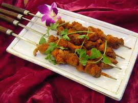 烤羊肉串是將肉切成薄片,一一穿在鐵釬子上,然后均勻地排放在烤肉爐上,撒上精鹽、孜然和辣椒面,上下翻烤數(shù)分鐘即可食用。味道微辣中帶著鮮香,不膩不膻,肉嫩可口。過去,做烤肉串用的釬子都是用紅柳的細條截削而成的木釬。現(xiàn)在,這種原始的木釬很難看到了。這種肉食不僅深受新疆各族群眾喜愛,也深受關(guān)內(nèi)一些地區(qū)漢族群眾歡迎,現(xiàn)在關(guān)內(nèi)很多地區(qū)都有烤羊肉串了,可以說烤羊肉串以它獨特的風味成為風靡全國的一種小吃。