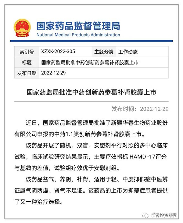 2022年12月29日,這是全疆全國(guó)醫(yī)藥界值得慶賀的重大喜慶日子!新疆華春生物藥業(yè)股份有限公司(以下簡(jiǎn)稱:華春藥業(yè))向國(guó)家藥監(jiān)局申報(bào)的國(guó)家十三五“國(guó)家重大新藥創(chuàng)制·科技重大專項(xiàng)”抗抑郁癥 1.1類中藥創(chuàng)新藥“參葛補(bǔ)腎膠囊”獲批上市!這是全國(guó)醫(yī)藥界可喜可賀的盛事!更是新疆醫(yī)藥界國(guó)家1類創(chuàng)新藥!開創(chuàng)了新疆擁有國(guó)家1類創(chuàng)新藥的新紀(jì)元!