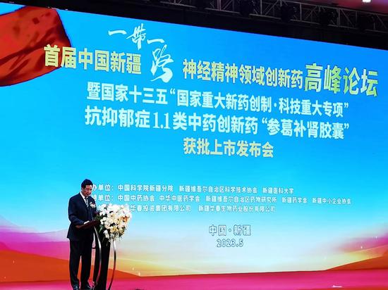 中新網(wǎng)新疆新聞5月26日電 (記者 閆文陸)由中國科學(xué)院新疆分院、新疆科學(xué)技術(shù)協(xié)會和新疆醫(yī)科大學(xué)聯(lián)合主辦的首屆中國新疆“一帶一路”神經(jīng)精神領(lǐng)域創(chuàng)新藥高峰論壇暨國家十三五“國家重大新藥創(chuàng)制•科技重大專項”抗抑郁癥1.1類中藥創(chuàng)新藥“參葛補腎膠囊”獲批上市發(fā)布會,26日于烏魯木齊舉辦。