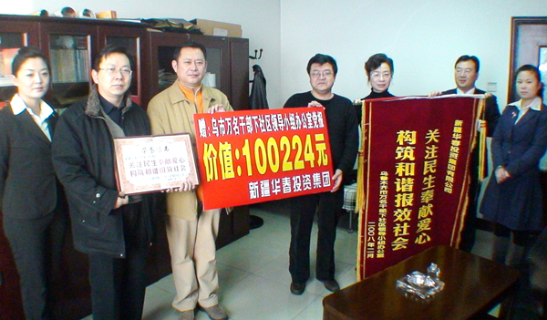 新疆華春投資集團(tuán)為以實(shí)際行動落實(shí)黨的十七大關(guān)注民生、構(gòu)建和諧社會的精神,為使社區(qū)及時了解到黨和國家的各項路線方針政策與有關(guān)新聞信息動態(tài),同時感受社會各界對社區(qū)的親切關(guān)注,配合烏魯木齊市萬名干部下社區(qū)的活動,在新春佳節(jié)即將到來之際,出資10萬余元,訂購全年的《新疆經(jīng)濟(jì)報》348份,于2月1日贈送到烏魯木齊市萬名干部下社區(qū)領(lǐng)導(dǎo)小組辦公室,將黨報贈送到市委市政府直接聯(lián)系的社區(qū),為基層社區(qū)提供精神食糧。