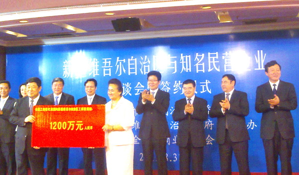 會(huì)上,全國(guó)工商聯(lián)代表團(tuán)向自治區(qū)工商聯(lián)捐贈(zèng)了1200萬(wàn)元,以用于新疆的社會(huì)公益事業(yè)。