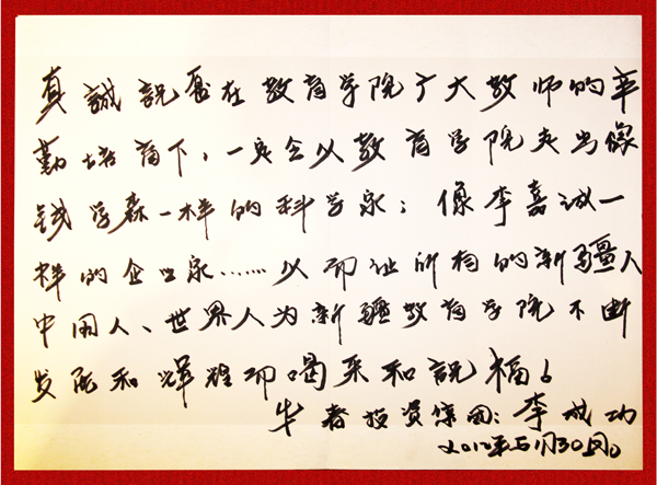 報(bào)告會(huì)結(jié)束后,李成功總裁一行參觀了新疆教育學(xué)院發(fā)展史陳列室,并為該學(xué)院題辭。