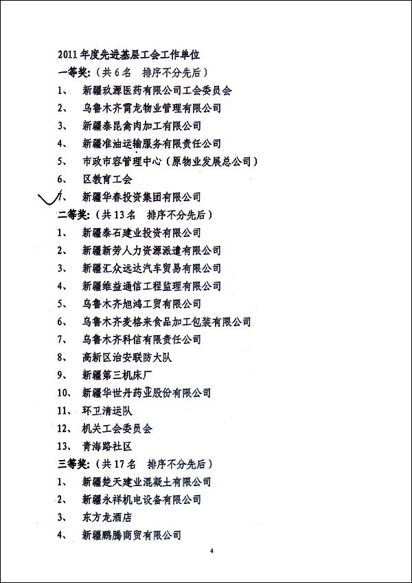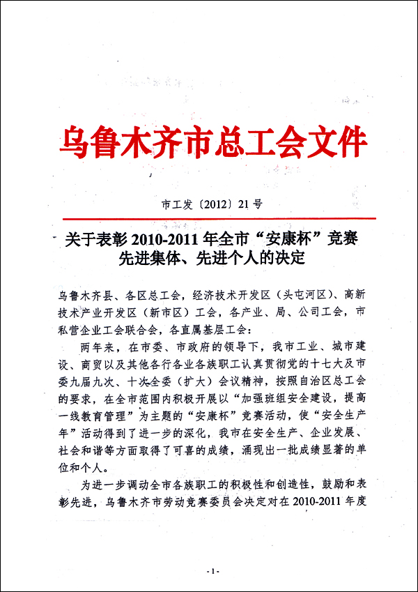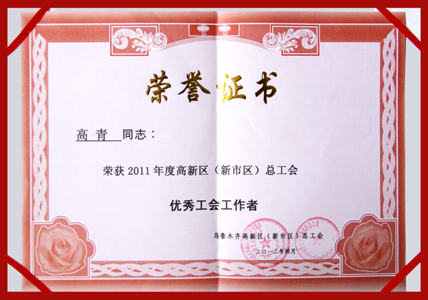 在剛剛結(jié)束的工會工作年度評比中,華春工會與華春工會主席高青被高新區(qū)(新市區(qū))總工會評為“先進基層工會一等獎”、“優(yōu)秀工會工作者”,同時榮獲由烏魯木齊市總工會、市安全生產(chǎn)監(jiān)督管理局評定的“2010-2011年安康杯競賽先進集體”。
